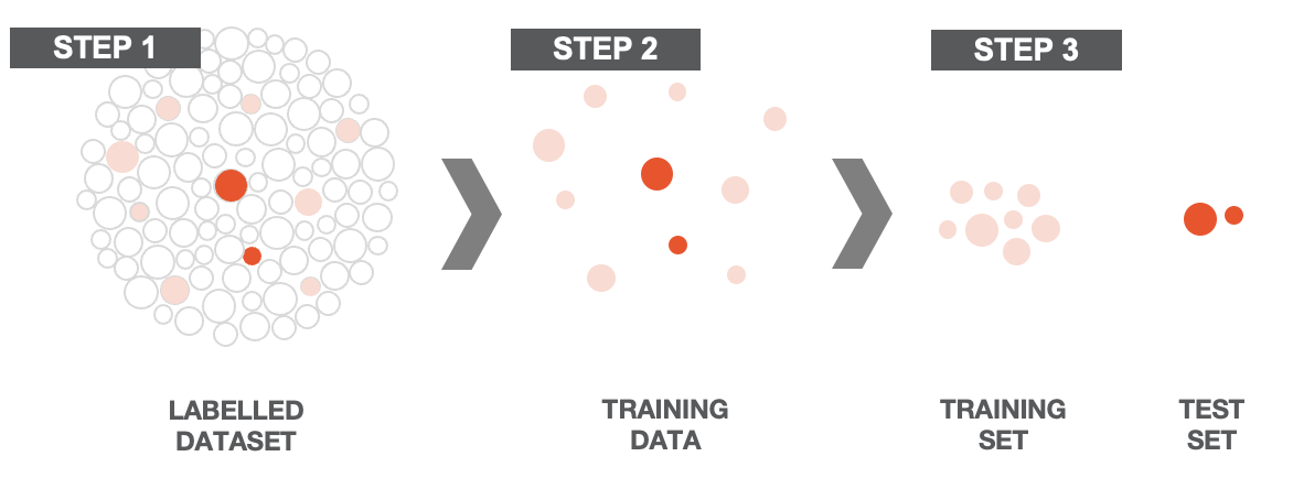 In the following image, the coloured dots represent the annotated messages within a dataset. This split is determined by the message ID when the messages are added to the dataset, and remains consistent throughout the life of the dataset.
